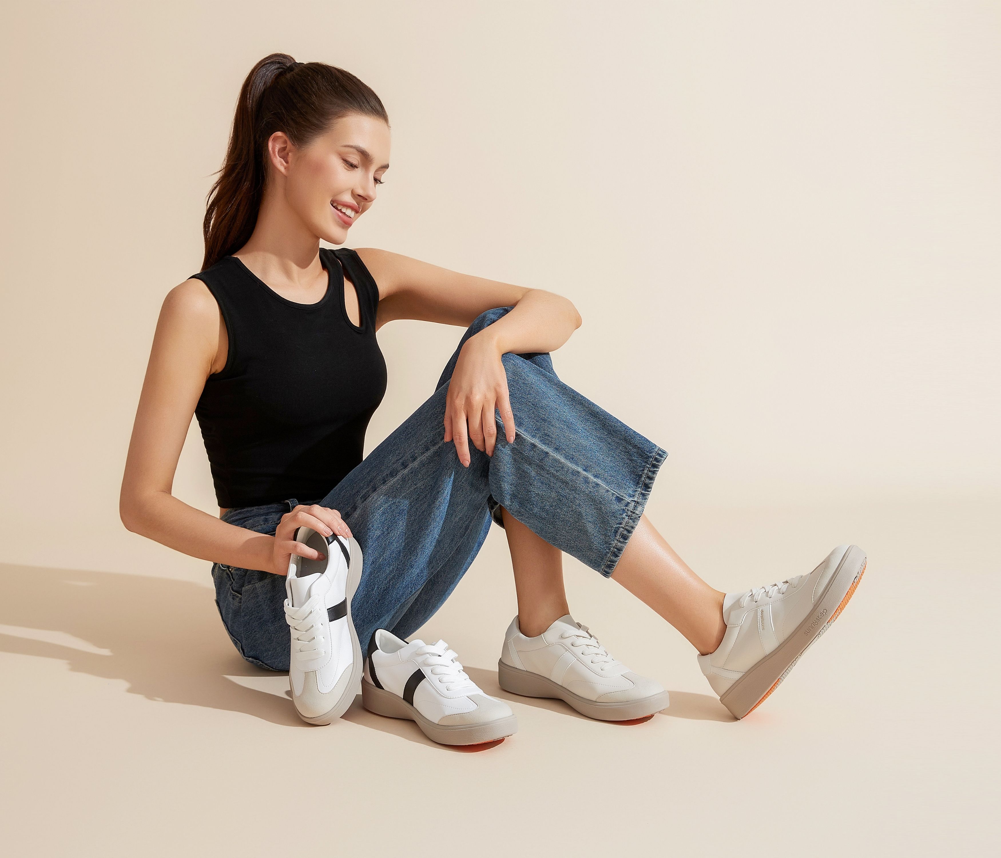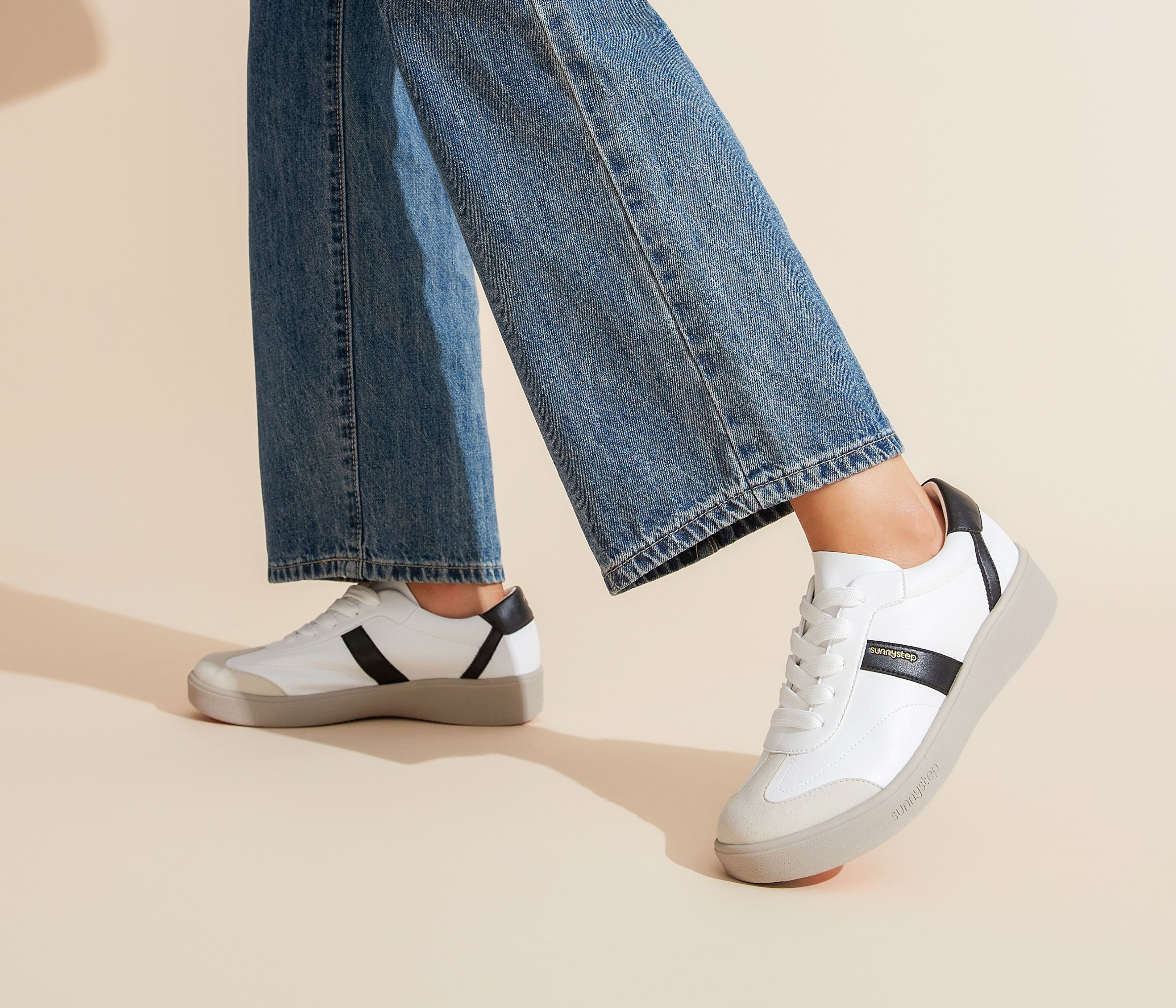 Available in clean white, all-black, and soft oatmeal tones, each pair features a contrasting stripe detail that adds a subtle, sporty edge. The cushioned sole and stable arch support keep every step light and supported, while its breathable construction and lightweight design ensure lasting comfort from active days to relaxed weekends.